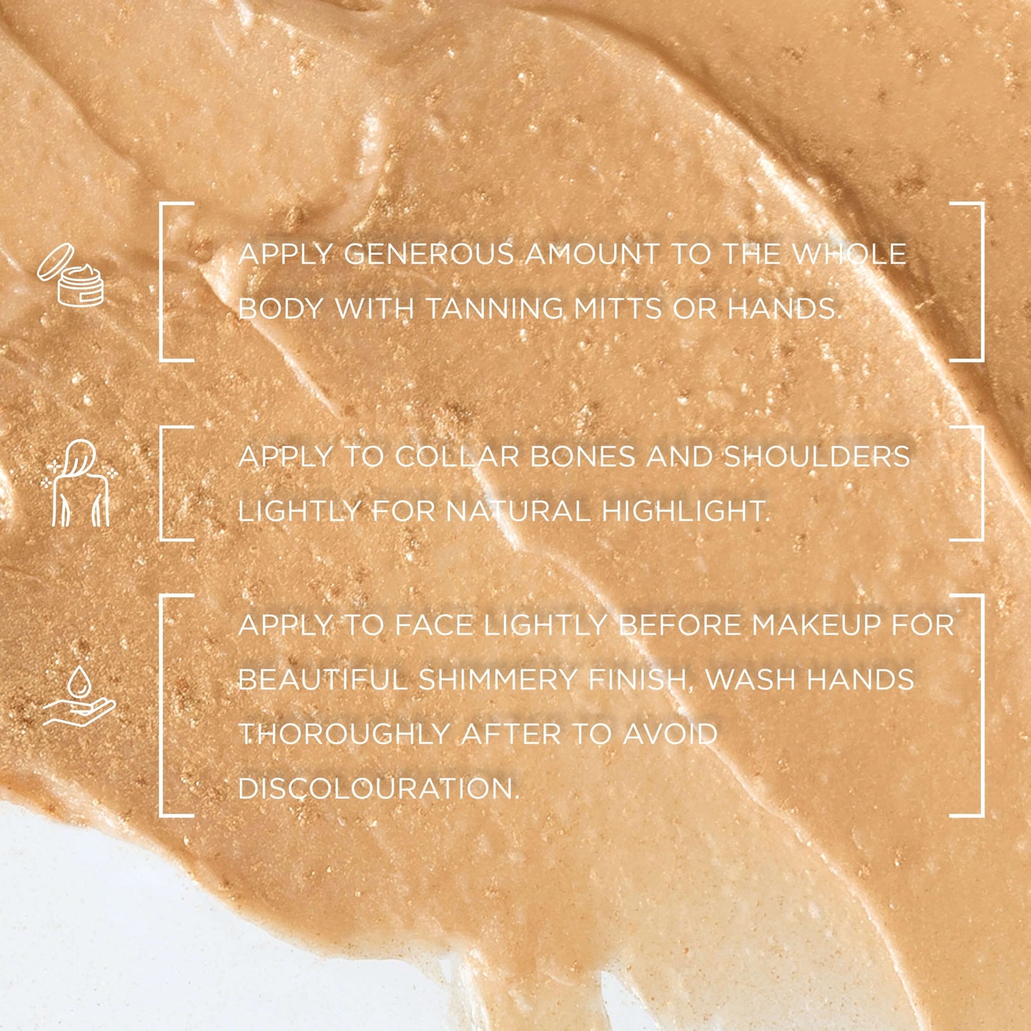 Aqua (Water), Butyrospernum Parkii (Shea Butter), Prunus armeniaca kernel oil (Apricot Oil), Cera Alba (Bees Wax), DHA (Dihydroxyacetone), Rubus Idaeus (Raspberry) Seed Oil, Erythrulos, Tocopherols (Vitamin E), Glycerin,Avena Sativa (Oat Kernel Oil),Citrus limon (lemon Essential Oil),Helianthus Annuus (Sunflower Seed Oil), Morus nigra (Mulberry Oil),Gold Mica Dust, Leucidal (Radish Root Ferment filtrate).