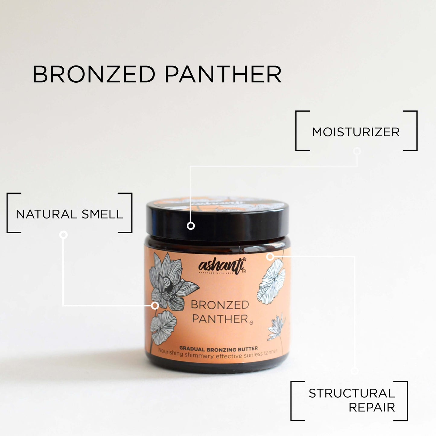 Bring the warmth of the African sun from your head down to your feet with the Bronzed Panther Gradual Bronzing Butter that enhances and promotes a warm bronze hue while maximizing skin smoothness and hydration.