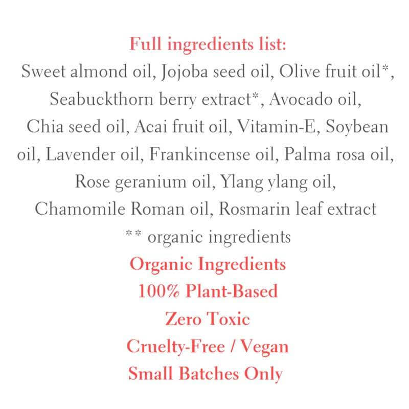 Prunisamygdalus (sweet almond) dulcis oil, simmondsiachinensis (jojoba) seed oil,oleaeuropaea (olive) fruit oil*, hippophaerhamnoides(seabuckthorn berry) kernel extract*, perseagratissima (avocado) oil,salvia hispanica (chia seed) seed oil, euterpeoleracea (acai) fruit oil, tocopherol(vitamin e), glycine soja oil, lavandulaangustifolia oil (lavender), boswelliacarterii oil (frankincense), cymbopogon martini oil (palmarosa), pelargonium roseum leaf oil (rose geranium), cananga odorata flower oil (ylangylang), anthemisnobilis flower oil (chamomile roman) rosmarinus officinalis leaf extract ** organic ingredients